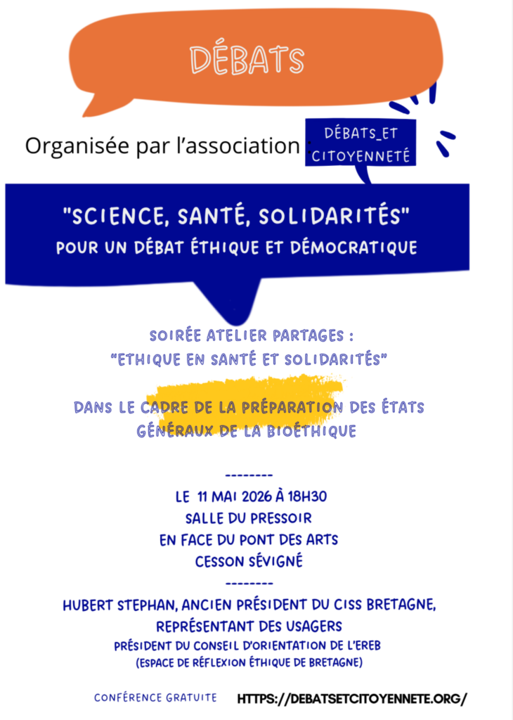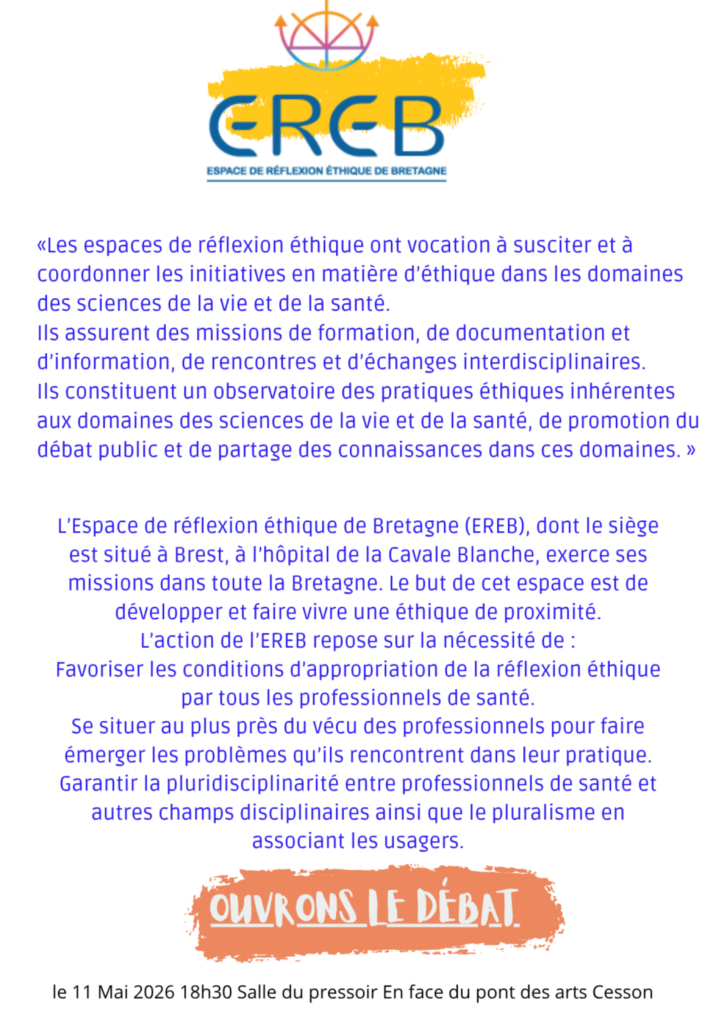 Débats et Citoyenneté, avec EREB (association éthique de bretagne), organisent une réunion débat sur ces questions fondamentales autour des thèmes suivants (trois seront retenues en début de séance par les participants après une brève présentation de chaque sujet par l'animateur de l'EREB).